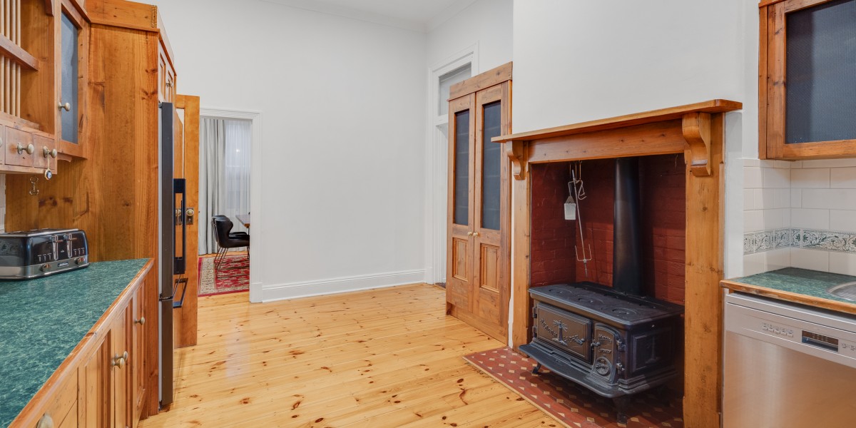 – Large timber kitchen with quality stainless steel appliances, ample bench space, and a functioning Metters wood stove.