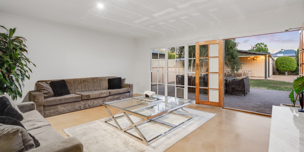 – Spacious living room with direct access to outdoor entertaining areas through double doors.