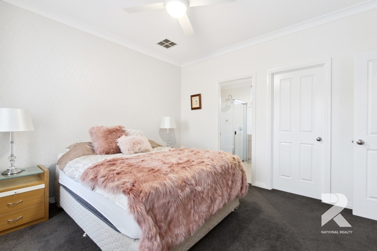 The heart of the home lies in the modern kitchen, featuring stone benchtops, stainless steel appliances, and a convenient dishwasher. The master bedroom offers the essential ensuite and walk-in closet, while the two remaining bedrooms provide ample storage with built-in robes.
