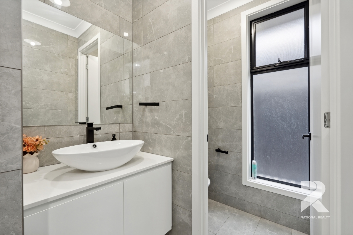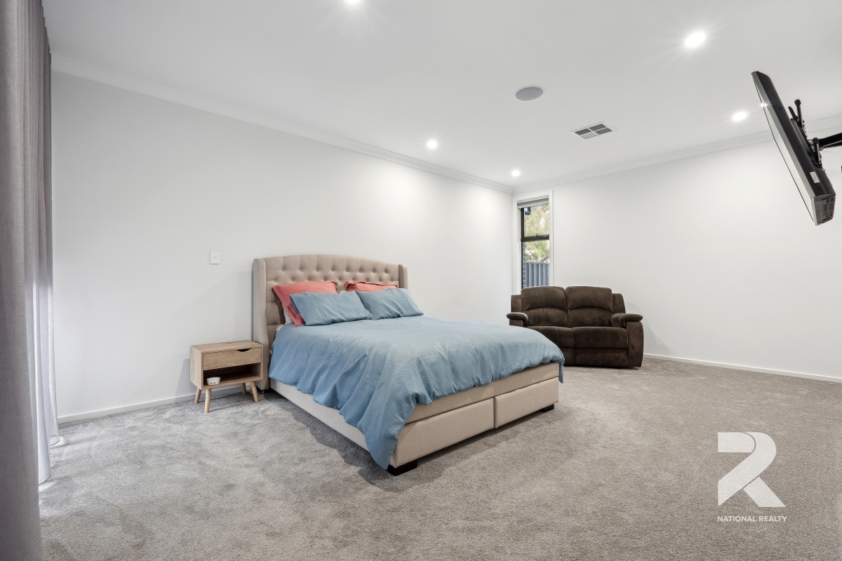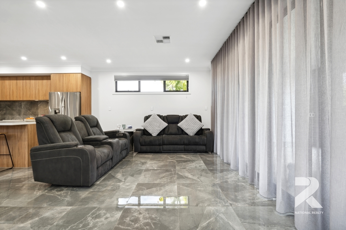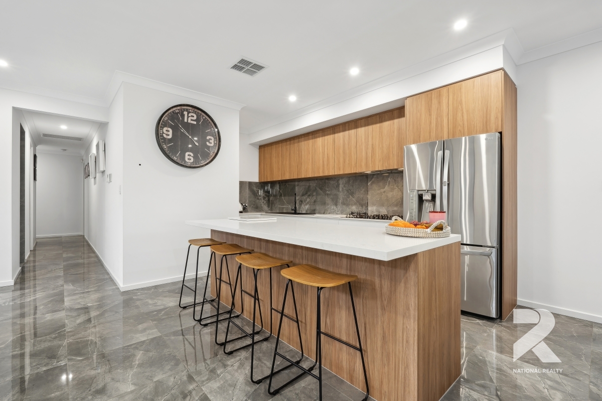 Located on the ground floor is the all-important master bedroom, complete with a separate retreat, a walk-in closet, and a stylish ensuite tiled floor to ceiling with stone bench tops, making every night feel like a vacation. The interior showcases tiled floors that complement the high ceilings, offering a sense of openness and warmth. At the heart of the home is a state-of-the-art kitchen with an open-plan design, a practical island, gas cook top, walk-in pantry, stainless steel appliances, and 40mm stone bench tops.