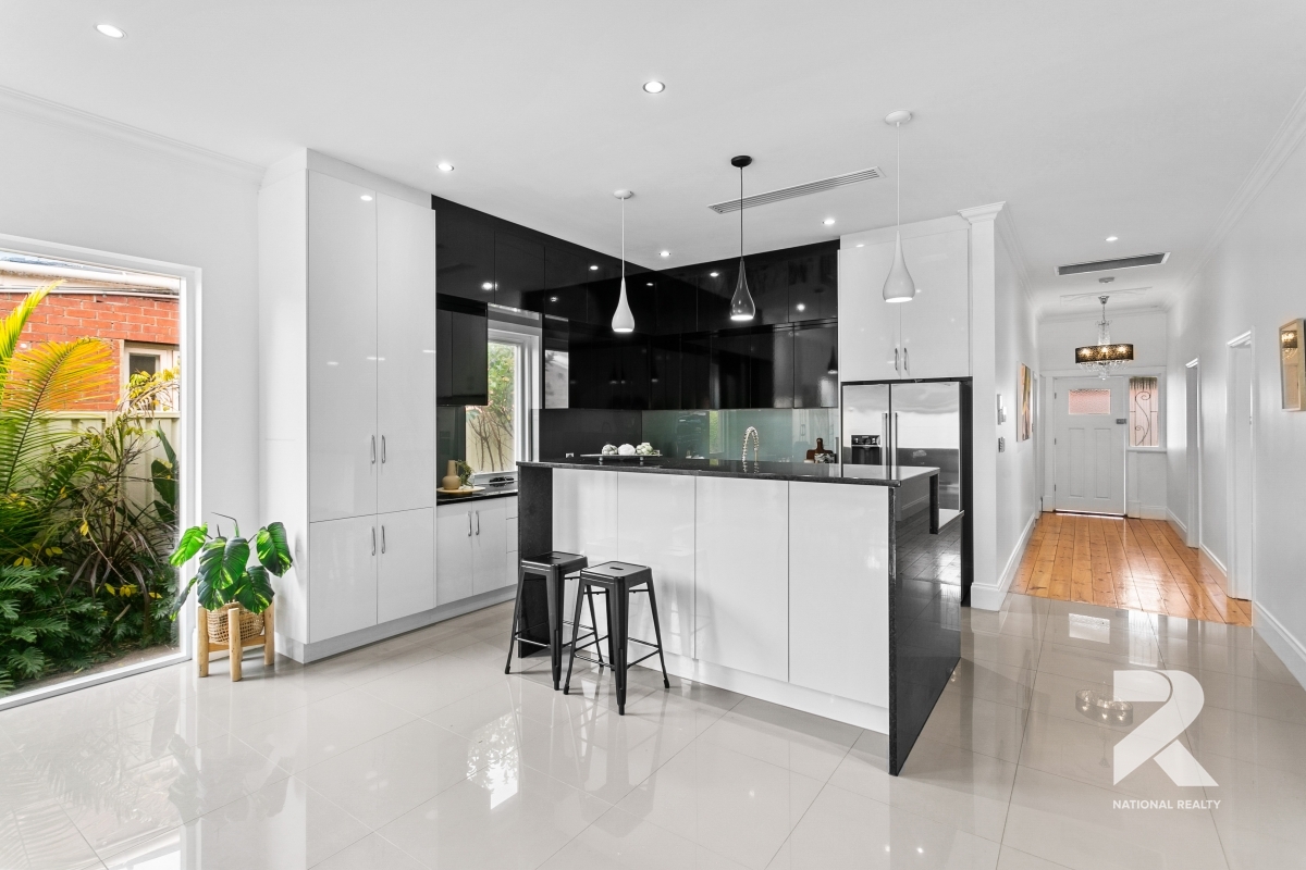 Immediately, upon entry, the abundance of light brings you straight into exceptional open plan living accompanying a polished timber floor entrance and stunning soaring ceilings throughout. Comprising of three bedrooms, 2 bathrooms together with a spacious kitchen, meals and living area topped off with the impressive outdoor entertainer’s dream. Walking you through – the sizable vintage main bedroom to the right with double basin ensuite and BIR to complete. Furthermore, the remaining 2 bedrooms all come with ornate decorative fireplaces in true original style, and all serviced by the decadent family luxurious bathroom fully tiled from floor to ceiling and full sized bath.