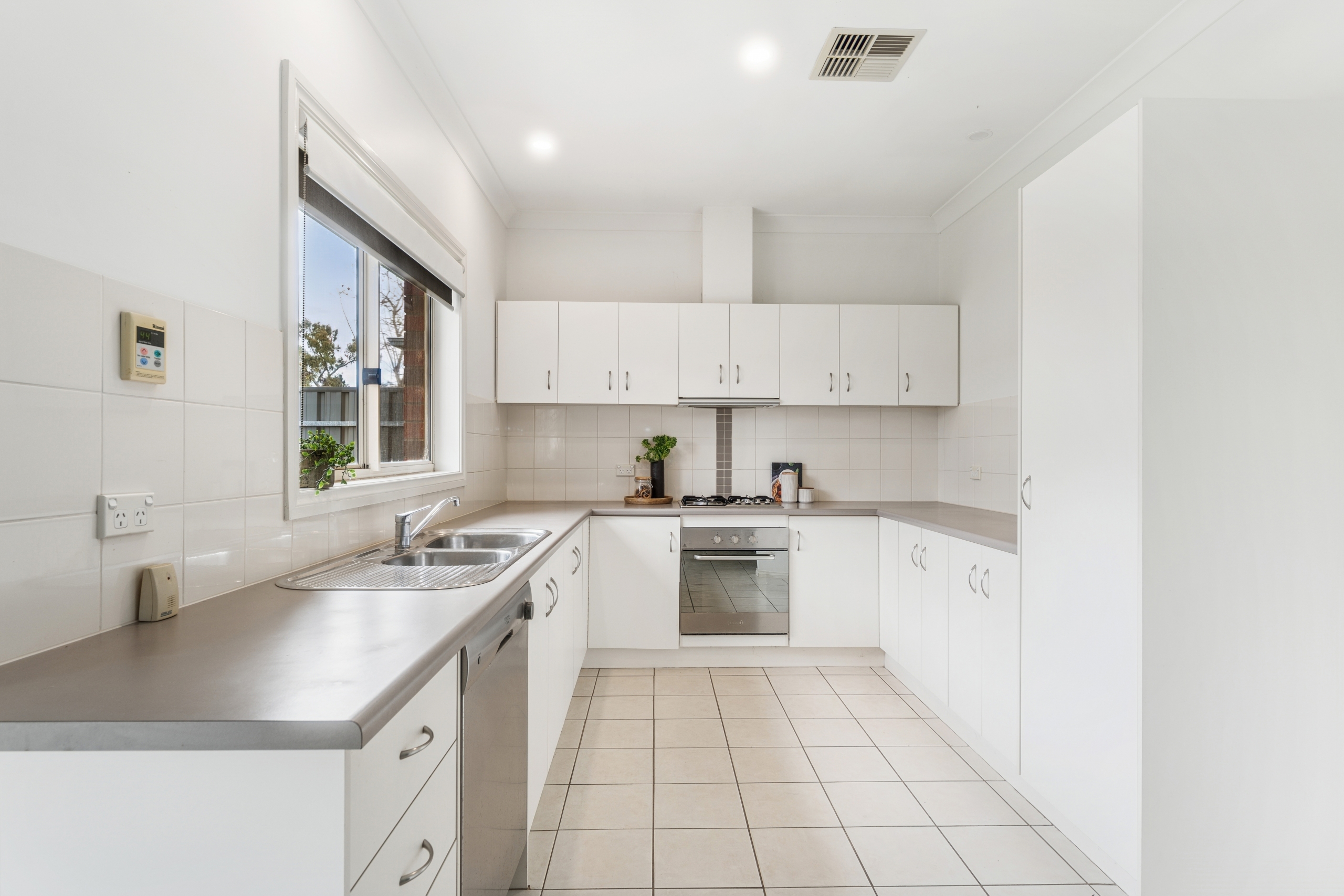 At the heart of the home lies a functional kitchen complete with gas cooking, a dishwasher, ample storage, and a breakfast bar that overlooks the open-plan living and dining area. This inviting space flows seamlessly to a paved outdoor courtyard – perfect for entertaining, enjoying your morning coffee, or hosting summer barbecues.