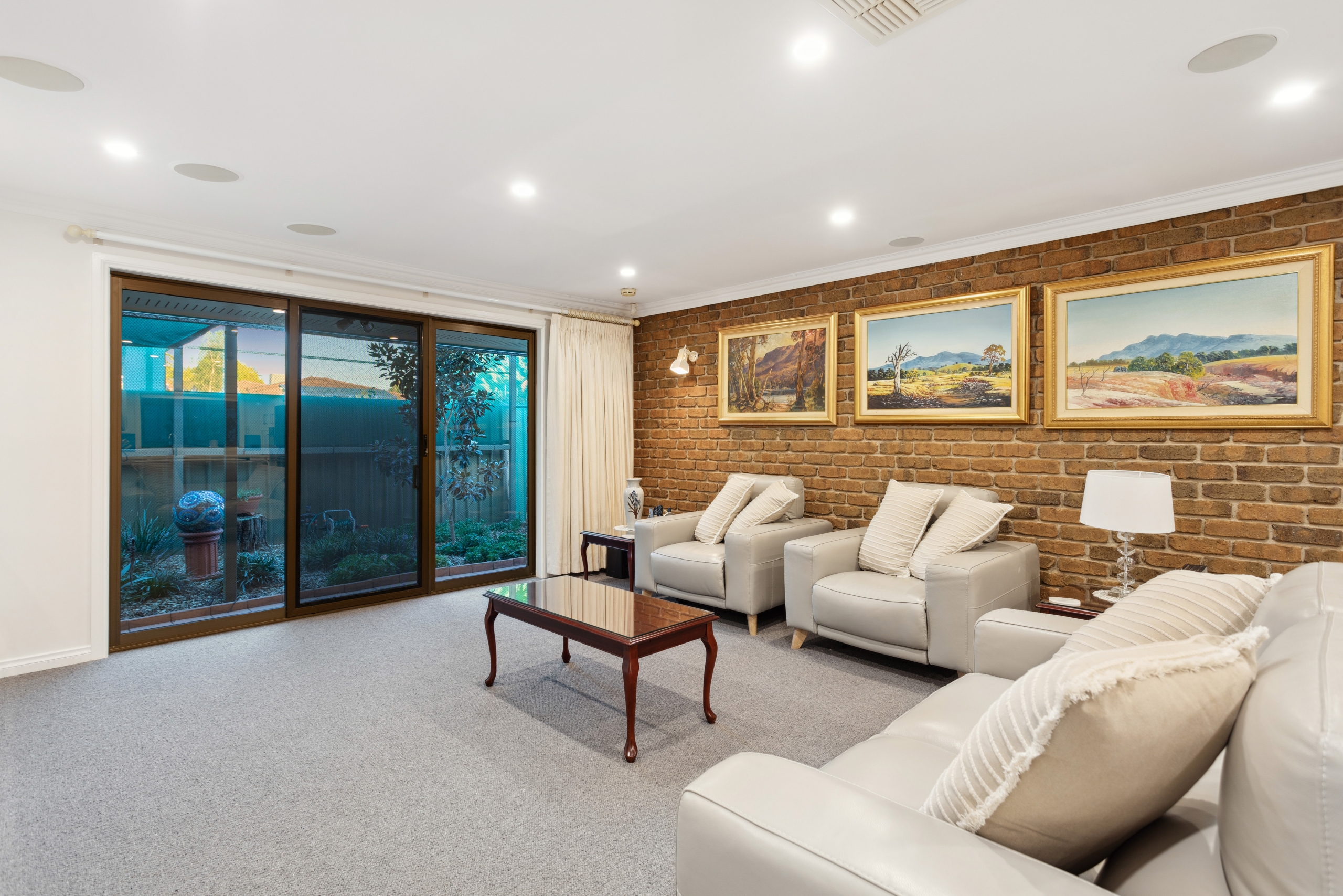 An inviting open-plan living area with decorative ceilings and large windows creates a warm and welcoming atmosphere. Flowing seamlessly to the undercover pergola, this space is ideal for year-round entertaining. The private courtyard is beautifully maintained, offering a serene outdoor escape.