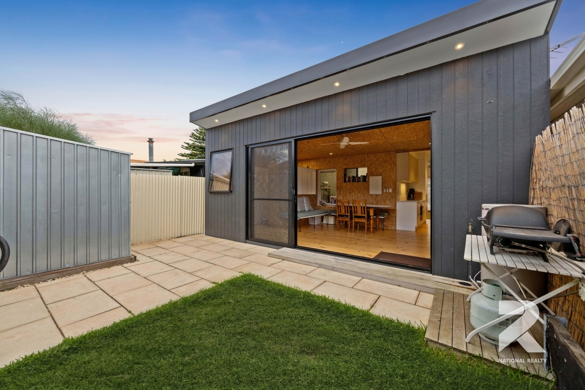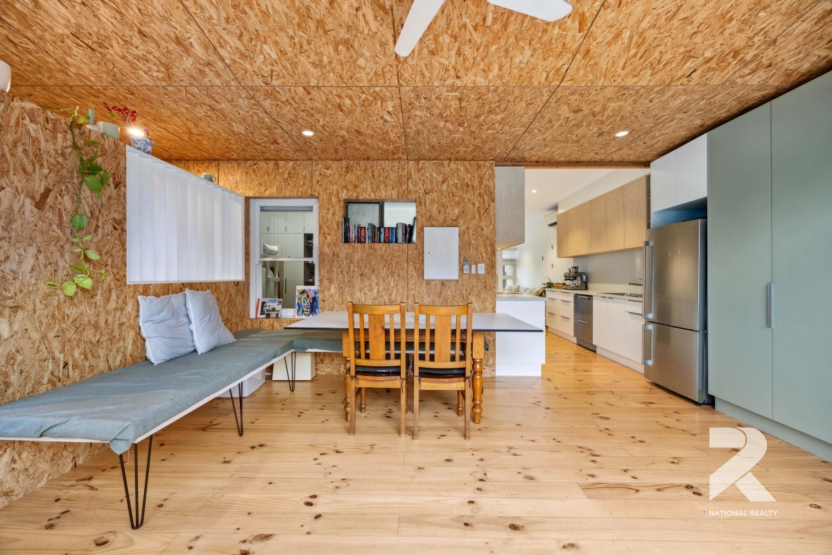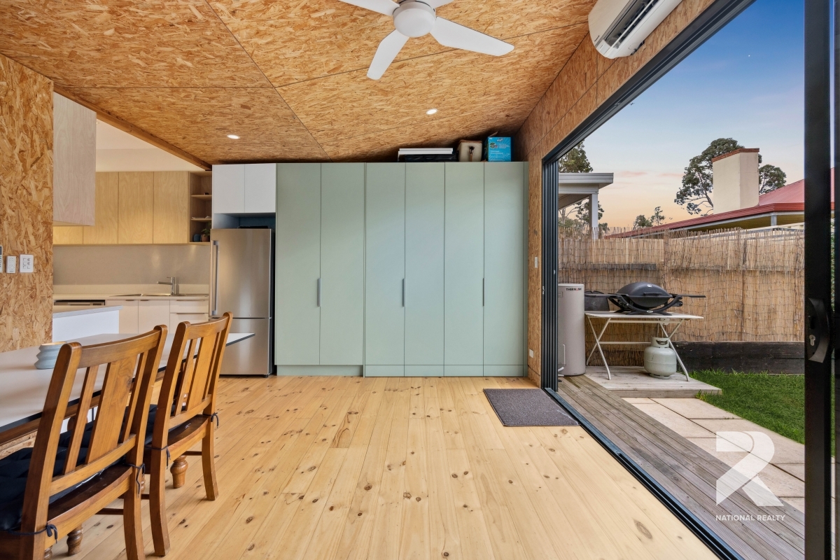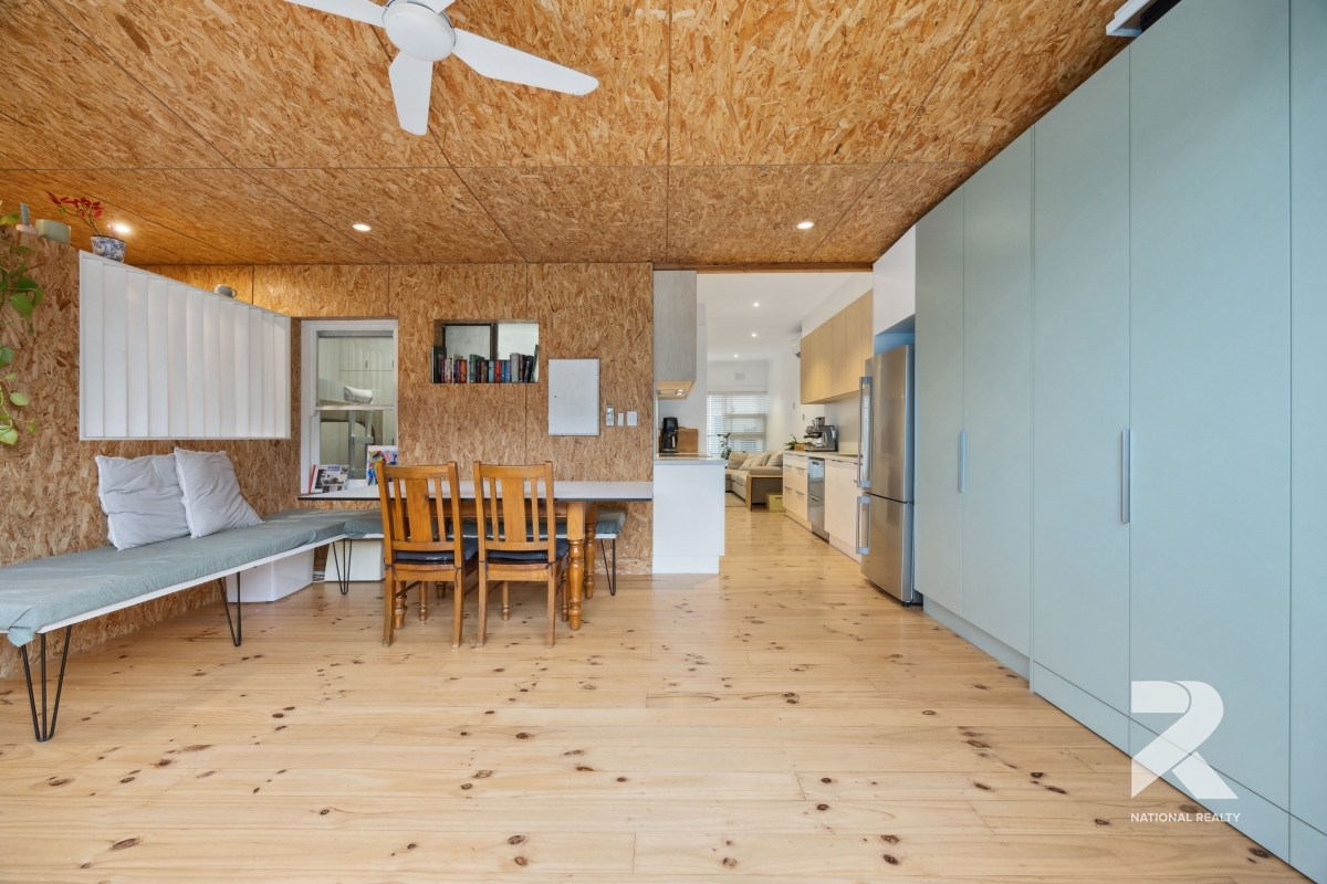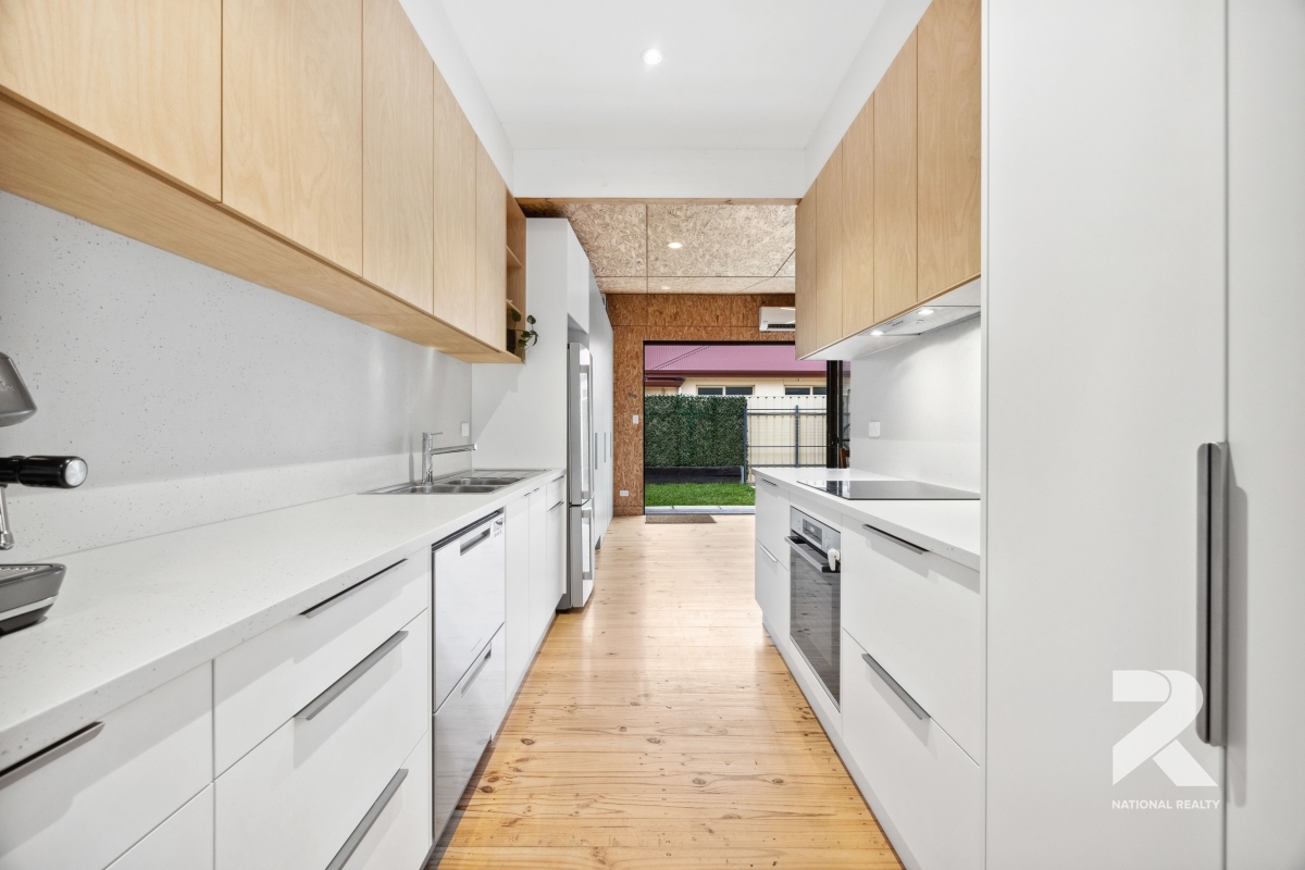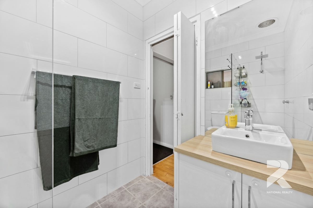 The modern kitchen is a standout, featuring stainless steel appliances, a dishwasher, an electric cooktop, and sleek benchtops that add a touch of elegance. The fully tiled, updated bathroom complements the home’s stylish aesthetic.