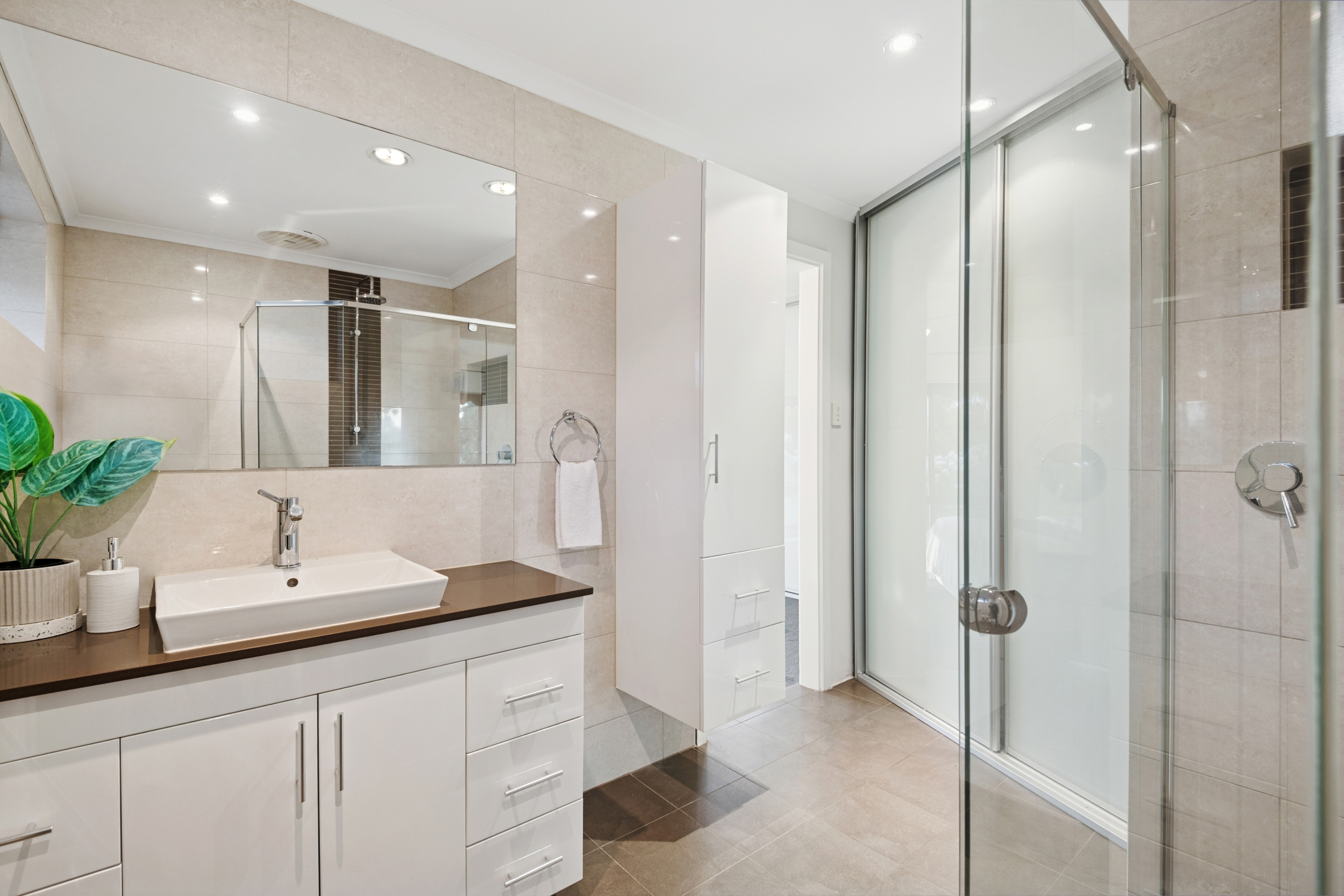Three additional bedrooms are serviced by a stylish main bathroom with a double vanity and floor-to-ceiling tiling.