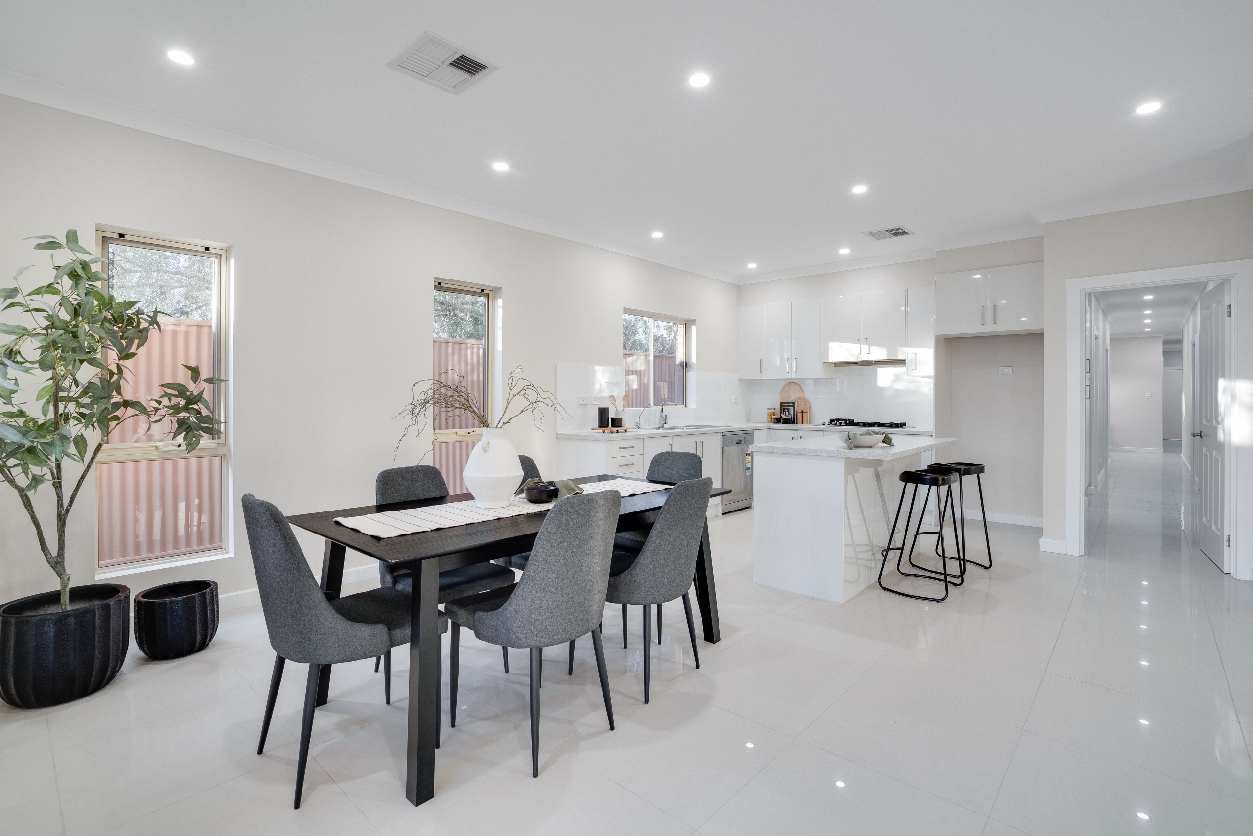 At the heart of the home, the modern kitchen stands out with its sleek design. It comprises an island that serves as a central gathering space, stainless appliances for efficient cooking, a gas cook top for culinary aficionados, and a dishwasher for easy cleanups. The open-plan concept allows the kitchen to blend seamlessly with the dining and living areas, creating an ideal space for entertaining.