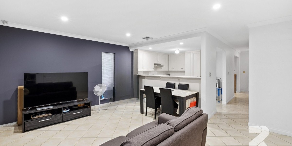 At the rear of the property, the contemporary kitchen takes centre stage, offering ample cabinetry and premium stainless-steel appliances, including a dishwasher and gas cooktop. The kitchen seamlessly integrates with a spacious open-plan living area, which extends to a delightful outdoor entertaining space-perfect for enjoying your morning coffee or hosting family and friends with summer BBQs on warm evenings.