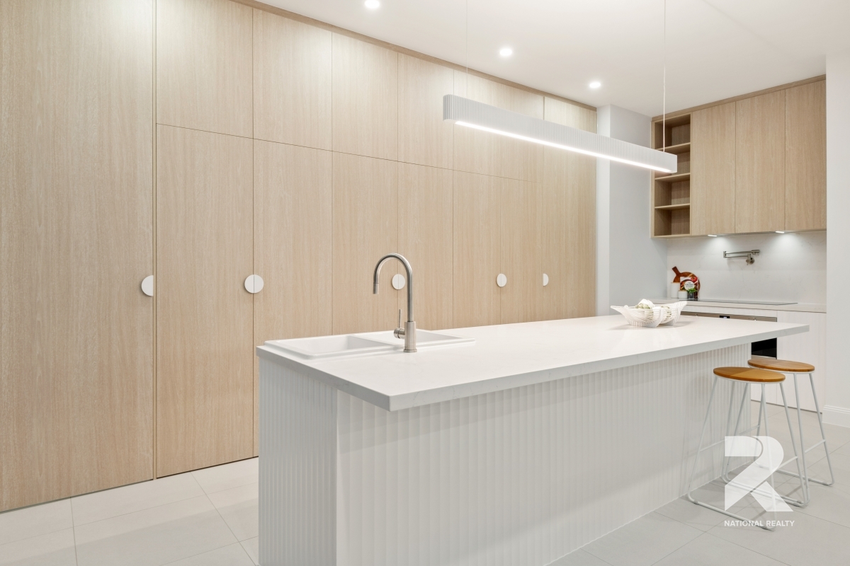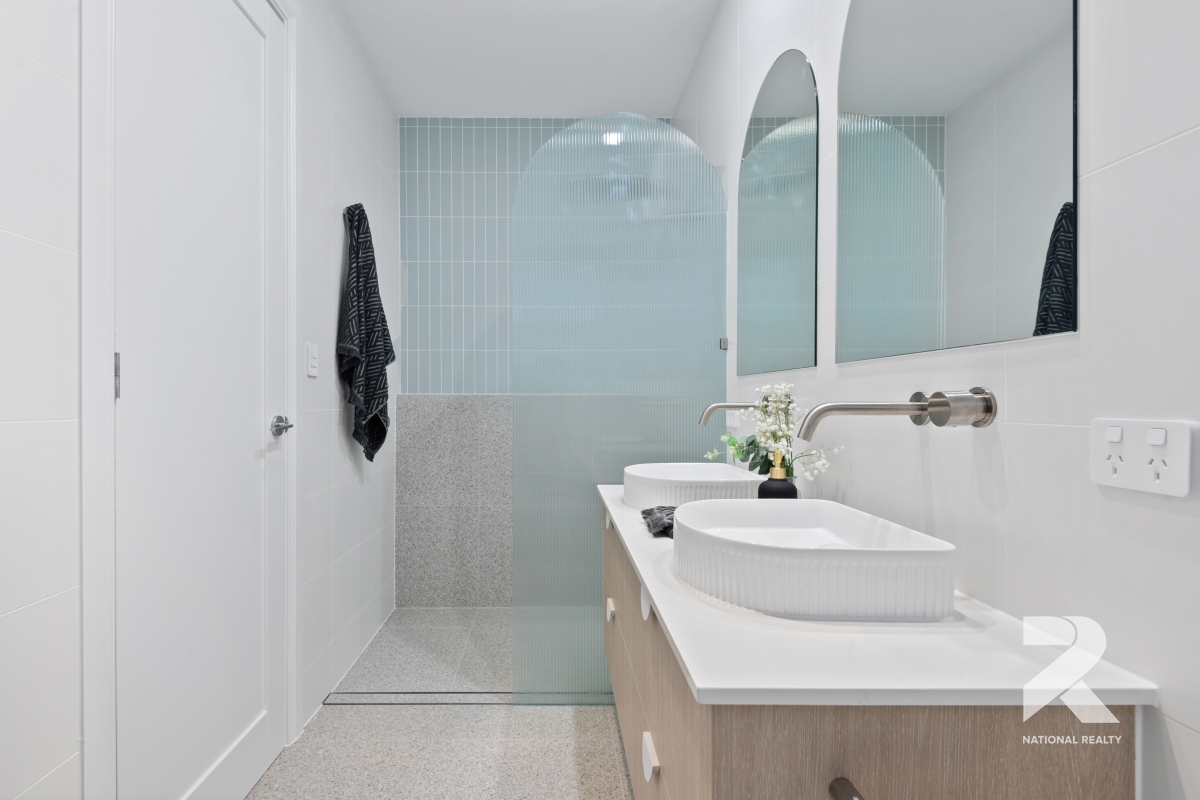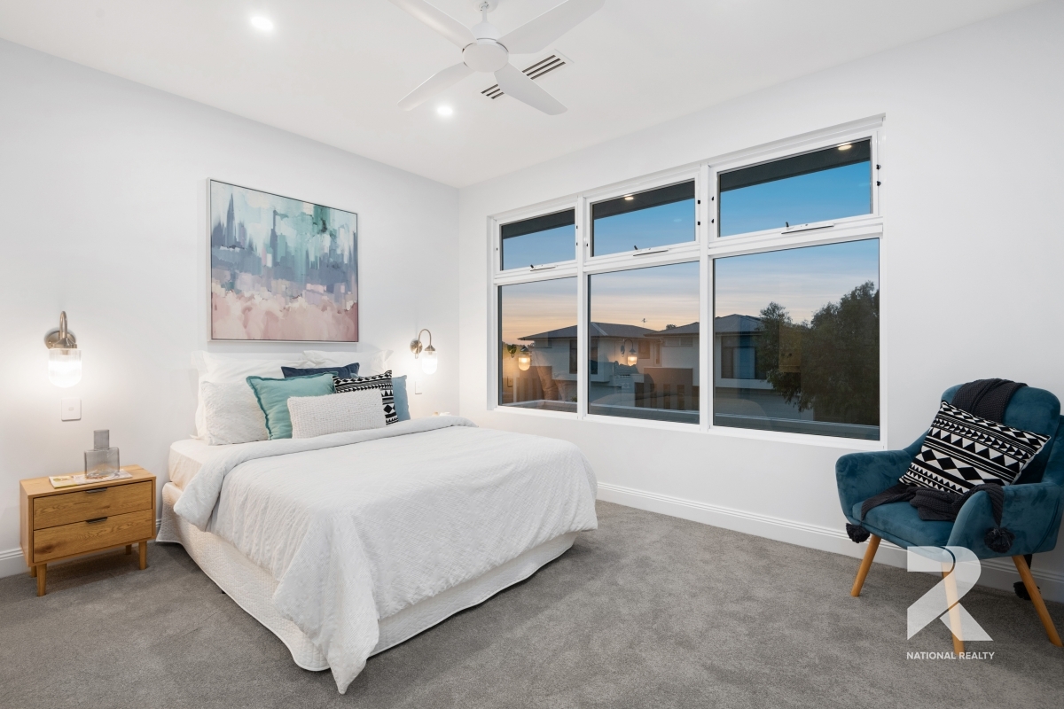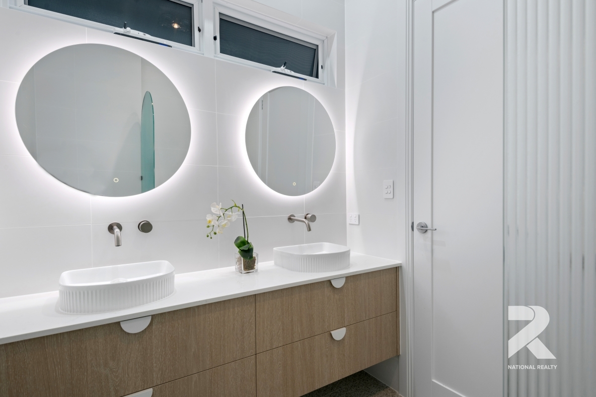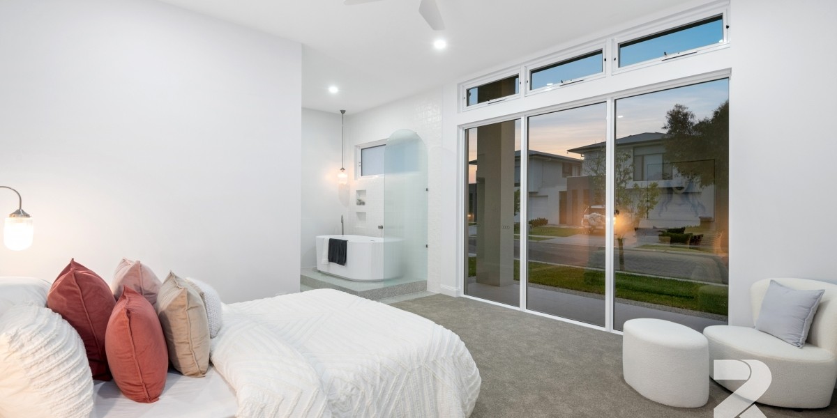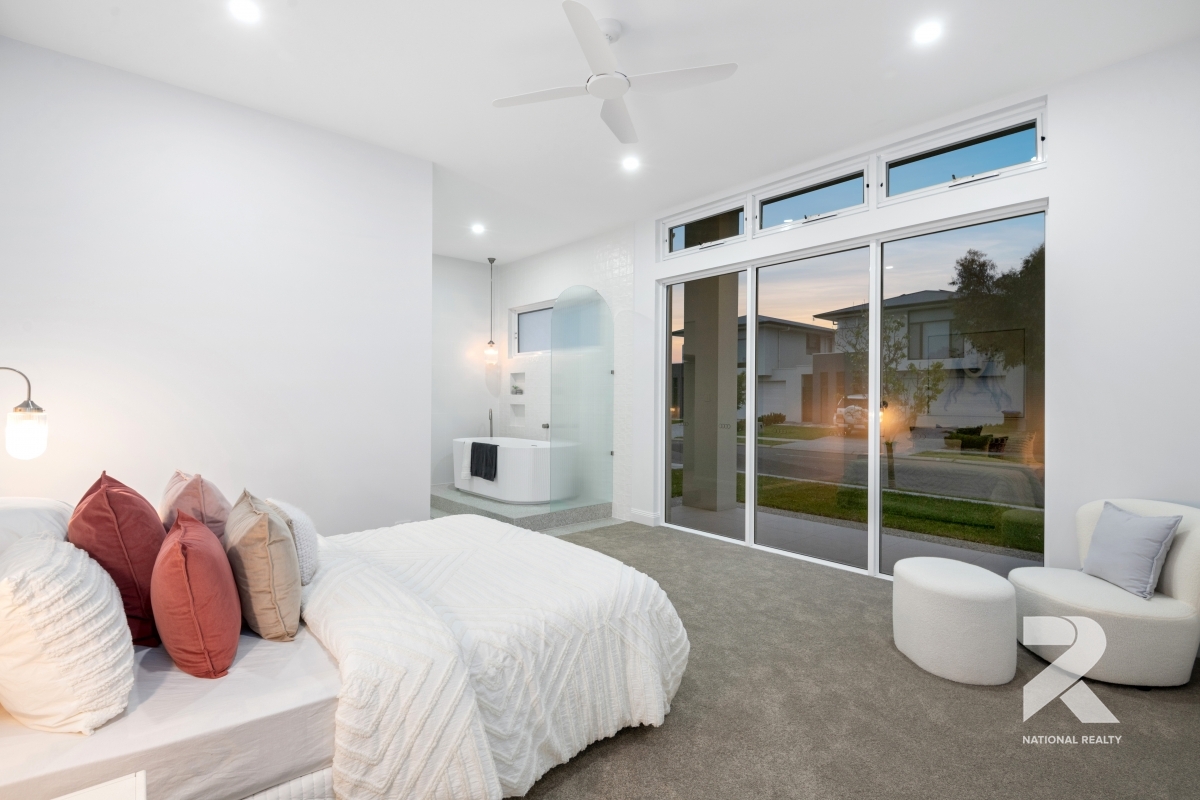 As you enter the home through the grand 3 metre high entrance door you will be instantly taken away with a feeling of grandeur that can only be described as inspiring. Located on the ground floor next to the stunning white spine and glass staircase is the master bedroom featuring a raised free-standing bath that has been purposely built to give you a day-spa feel in the comfort of your very own home. Walking through the robe leads to the ensuite with twin basins and LED mirrors giving this Master Bedroom that finishing touch only found in five-star hotels.